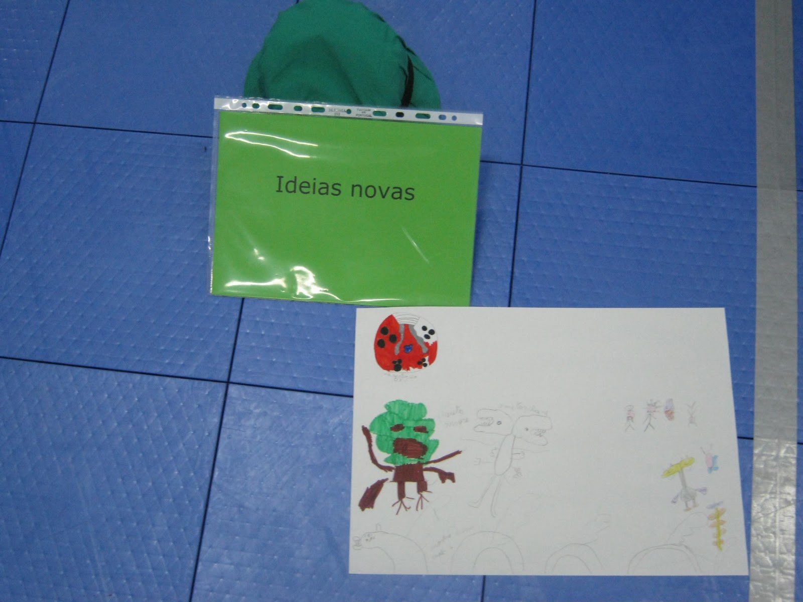 conjugámos o verbo «chapelar» e aprendemos um pouco sobre os seis chapéus do pensamento. os alunos «mais velhos» ajudaram os «mais novos» e o resultado foi um mapa mental com um chapéu de seis cores (o chapéu da imaginação, como diz o Tiago) no centro